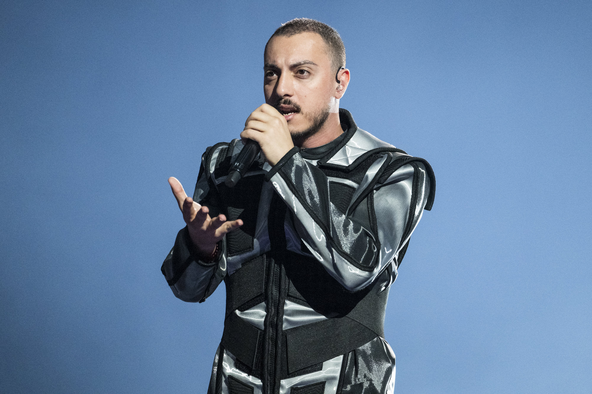 Raiven rehearsing Veronika for Slovenia at the First Rehearsal of the First Semi-Final at Malmö Arena